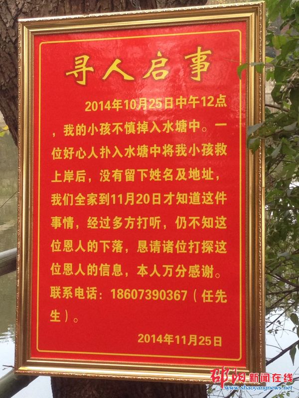 邵阳新闻在线讯(记者 宁如娟)12月8日,在城南公园池塘边的大树上,一块硕大的寻人启事悬挂着。红底配上加粗的字体,加上制作精良的边框,让这张告示显得格外打眼。这张寻人启事,寻找的是儿子的救命恩人。然而,让人感到奇怪的是,告示下方标注的时间却与告示中提及的儿子落水被救事件相差了整整一个月。为什么这位父亲在事隔一个月后,寻找起了救命恩人?