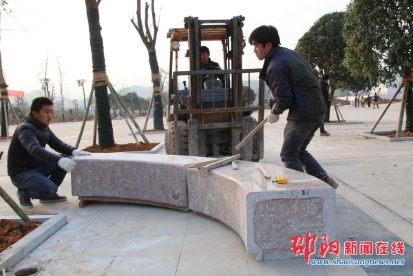 邵阳北站站前广场上,施工人员正在安装休闲石长凳。按照相关要求,站前广场的配套设施也要在高铁正式通车运行时完工,以方便乘客出行。