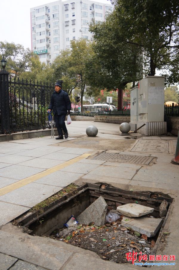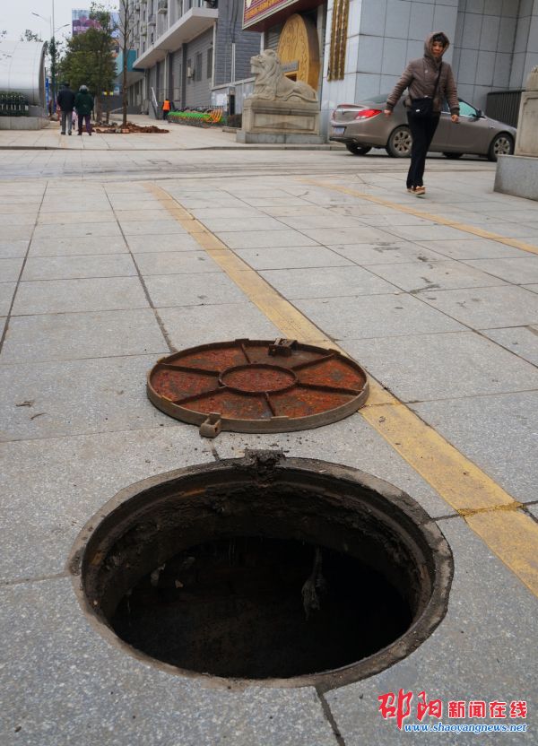 邵阳新闻在线讯(记者 林森)圆形井盖被掀翻在一边,半米多高的空井“张口”等待着粗心的行人;方形窨井的井盖完全塌陷,井内堆着垃圾和碎石块。12月11日,敏州西路中国人民银行附近路段上演“步步惊心”,人行道上的2处陷阱相距不到5米,且周围没有任何提醒标志,希望有关部门引起重视。