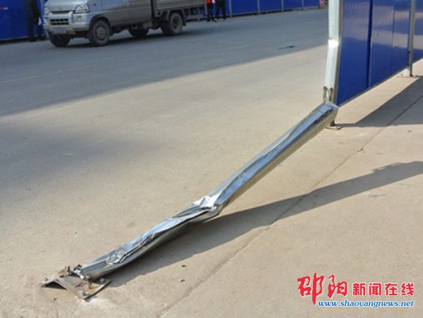 在二纺机菜市场的西边,临街门店前,已看不到几块完整的蓝色挡板。侥幸剩下的一两块挡板,也残缺不全,挡板里的泡沫裸露出来,撒了一地,风一吹,苦了环卫工。湘印机附近路段的一些门店前,只能看到用来支撑挡板的钢柱。这些钢柱有的孤零零地竖立在人行道上,有的横卧在地。在邵阳医专、市科协等多个路段,凌乱分布的挡板和钢柱在道路上显得格外突兀。