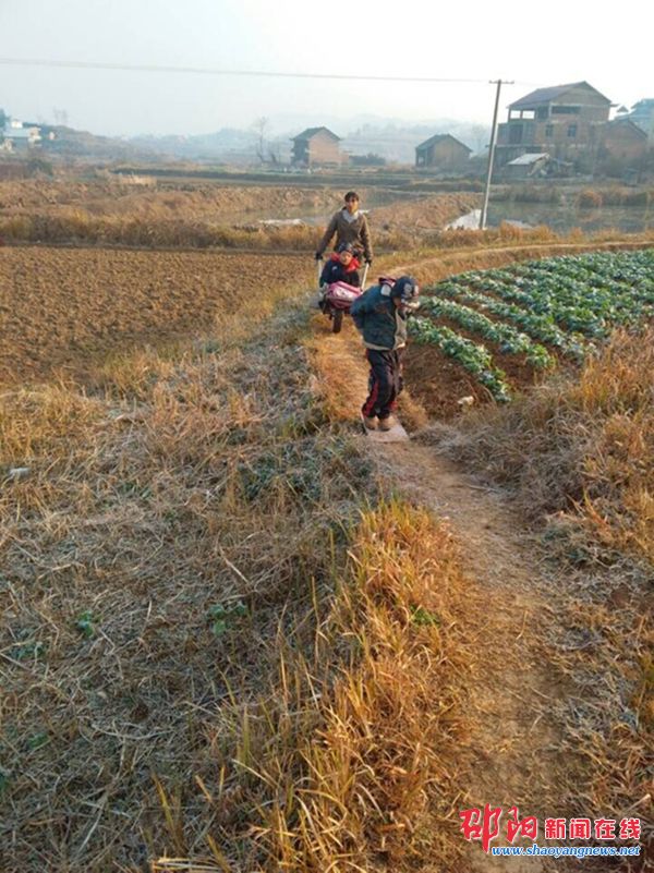今年春节过后,刘飞云做了一个重要的决定:让她两个患脑瘫的儿子去上学。虽然家离学校不远,每天上学刘飞云都要提前准备半个小时。因为两个小孩走路的时候,随时会摔倒,所以一辆独轮车成了母亲送两个儿子上学唯一的工具。窄小的独轮车容不下两个小孩,一般大儿子走路,小儿子坐独轮车。田间小路凹凸不平,大儿子经常摔倒。每次摔倒他都勇敢地从地上爬起来,接着走。儿子在上课的时候,刘飞云会去附近的山头捡一些柴火,为晚饭做准备。