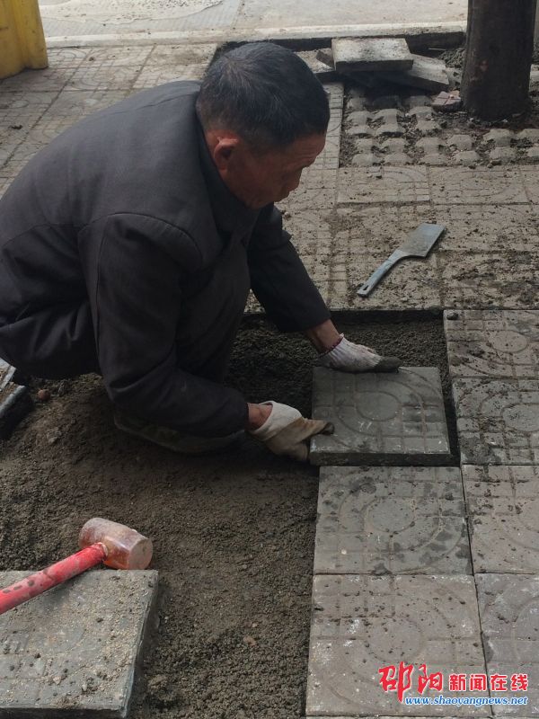 施工人员分为两队,一队在前对人行道进行检查,发现损坏的、凸起的、不牢的板砖,对其进行清除;另一队则进行修补,换上新板砖。