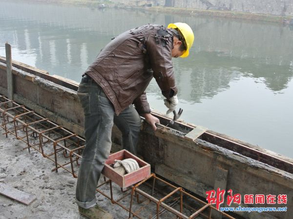 邵水西路人行道改造,正在更换新的沿河护栏。