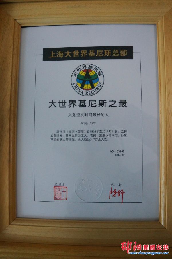 邵阳新闻在线讯(记者 林森 申兴刚)1月8日,廖连清收到了一份特别的礼物,上海大世界基尼斯总部为他寄来了最新版的“基尼斯记录”:廖连清(湖南·邵阳),自1963年至2014年11月,坚持义务理发,期间为工人、农民、离退休老同志、卧床不起的病人等理发,总人数达3.7万人次。