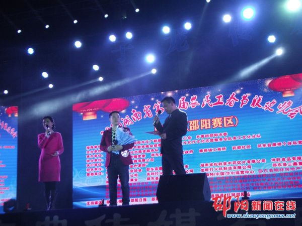 “我宣布,总决赛现在开始……”随着总导演朱良成的发言。2015年湖南省第四届农民工春节联欢晚会邵阳赛区总决赛于7时30分准时拉开了帷幕。一个个节目精彩纷呈,女声独唱、男声独唱、男女生对唱、笛子独奏《牧民新歌》、双勾书法、《小沈阳模仿秀》等等,三十二支节目各具特色,表演者为年龄不一,多才多艺的农民工,每一个节目表演完,有专业评选团亮分,决出一二三等奖。