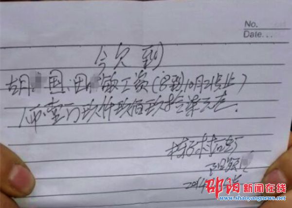 被欠薪的民工之一胡某国、田某敏是贵州人,他们来到新邵县潭溪镇椅子村砖厂打工,但砖厂老板没有按时发放2014年8月至10月21日之间的工资。11月5日,砖厂老板给胡某国出具1.61万元的工资欠条一张、给胡某国和田某敏出具1.9997万元一张。