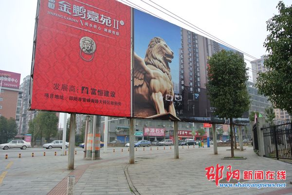 在敏州西路与雪峰南路的交汇处,记者看到李先生所说的那块广告牌。广告牌高约8米,由五根直径超1米的水泥石柱将其支撑着,上面印有“金鹏嘉苑”楼盘的广告。宽约10米的广告牌,占据了人行道的三分之二。
