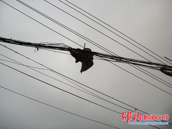 邵阳新闻在线讯(记者 谢婷婷)市民李先生反映:在市区东大路湖南天闻新华印务邵阳有限公司路段,由于道路改扩建,需要移走的树干在处理时留下几个比菜碗还粗的木头,悬挂在电线上。要是木头从电线上掉下来,砸伤行人怎么办?