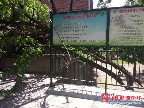 邵阳新闻在线讯(记者 陈贻贵 实习生 周鹏 刘思卿)6月27日上午,市区戴家坪农贸市场旁,一棵近10米高的槐树不堪重负,被大风吹倒,倚靠在人行道旁的栏杆上,所幸未造成人员伤亡。