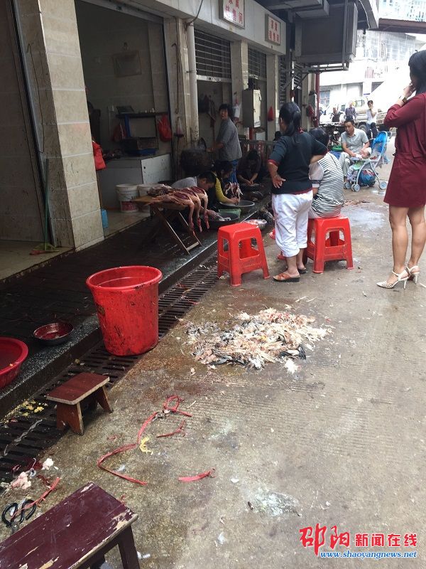 邵阳新闻在线讯(邵阳日报记者 曾旭辉)9月1日-6日,由邵阳市创卫办、市创“国卫”督查组成员对南门口农贸市场和大安街星级农贸市场进行暗访,发现这里存在管理无序,场内垃圾遍地,污水横流,周边卫生差等问题。9月15日,督查组又对这里进行回访,发现这些问题依然存在,且市场执法人员执法不力,商户占道经营严重,希望有关部门引起重视。图为市场内鸭毛堆在马路边。