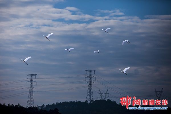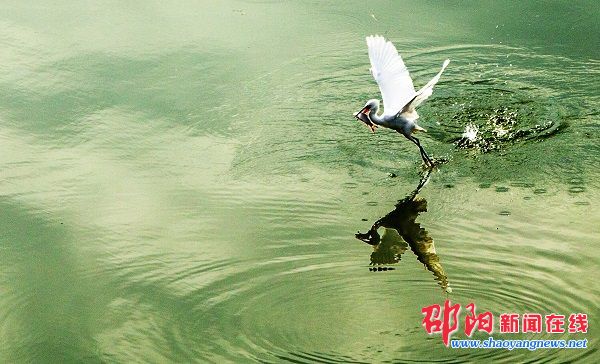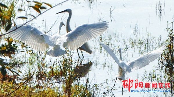 在邵阳县长阳铺泉井水库里,我们经常可以看到上百只白鹭一会儿在水面上飞起落下,一会儿在水库边漫步寻觅,好一幅恬然和美的画面。根据当地村民介绍:“这里的白鹭已有10多年了,而且一年比一年多,尤其是早上和傍晚,最大的鸟群,看上去有好几百只在水库的上空飞舞,有时四周的大树上鸟儿落满枝头。”