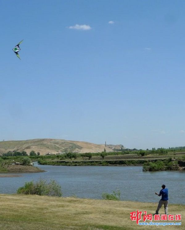 刘德其在地广人稀的户外放飞特技风筝.