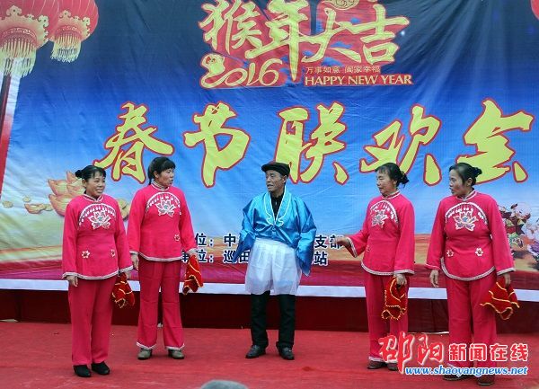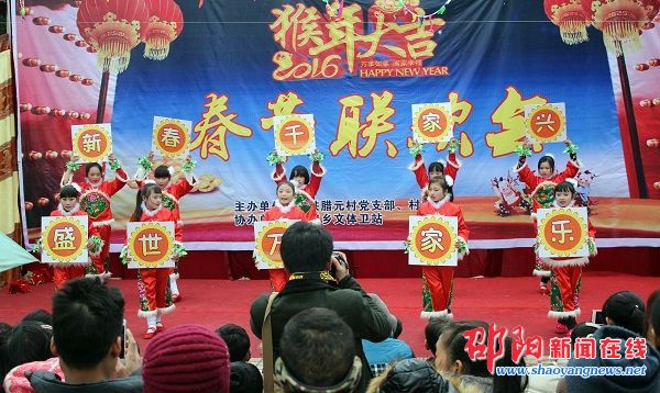 当天,尽管天空不作美,小雨淅沥沥下个不停,但腊元村一片沸腾,村里的男女老少打着雨伞挤在一起,翘首以盼一场由村民们自办的春节联欢会热闹开演。上午11时许,演出在欢快喜庆的开场舞《开门红》中拉开帷幕。联欢会的节目都是由村民自编自导自演,形式多样、内容丰富,包括独唱、少儿舞蹈、秧歌舞、快板、表演唱、戏曲表演等。充满乡音乡情的演出,让台上台下成为一片欢乐的海洋,为即将到来的春节增添了浓浓的节日气氛。