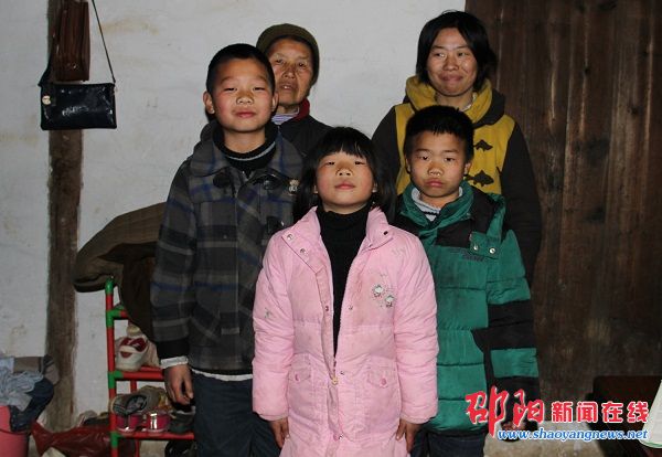 妻子肖菊梅是个苦命的女人,今年33岁,2005年与前夫同在广东打工相识,婚后两人有过甜美的幸福时光,2006年3月生下大儿子张昭昌,2008年6月生下龙凤胎张雅倩、张昭盛。天有不测风云,2008年8月,在东莞油漆厂打工的前夫因咳嗽日益严重,在当地误诊为重感冒,回到城步后才在县人民医院确诊为肺癌,并且已是晚期。妻子闻听前夫患绝症,无异于晴天霹雳,前夫才31岁,双胞胎出生不到3个月。两个月后,前夫瘦成皮包骨头,丢下妻儿老母含恨离世。前夫去世的前一年,也就是2007年,瘫痪在床16年的公公,灯枯油尽。两年间,家里失去两个男人,年老的婆婆和年轻的媳妇成了寡妇,家里失去了男劳力,也失去了经济收入来源,一时间这个家庭陷入了生活绝境。