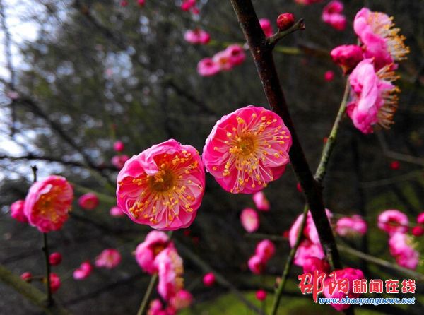 宝庆森林公园的美花不像城南公园等城区休闲健身场所一样,一般只有稀疏几株。在这里,既有老林科所人培育的“老梅园”,又有新林科所人栽培的“新梅园”,数目都在500株以上。新老梅园的梅花都以红梅为主,期中间杂些许白梅和黄梅。2月26日这天,大多数梅花仍在开放。远远望去,新老梅园似两块红色绸缎,而那白梅和黄梅则似一只只蝴蝶在绸缎上飞舞。