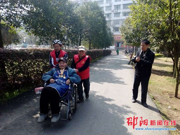 2月27日上午,市区关爱抗战老兵志愿者湘人老莫等十余人,带着牛奶、水果等礼物,再一次来到市区戴家坪看望曾瑞田。当天天气晴好,当得知曾瑞田多年很少出门,很想看看邵阳这几年的变化时,志愿者们于是推着轮椅带着他边走边看。曾瑞田胸佩由中共中央国务院、中央军委颁发的纪念抗日战争胜利70周年的纪念章,头戴绣着“抗战老兵”4个醒目大字的绒帽。过往市民无不投来敬慕的目光。