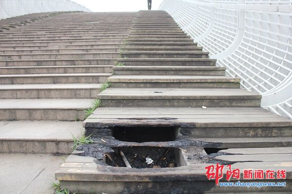 邵阳新闻在线讯(邵阳日报记者 伍洁)“木梯烧毁留下黑色的窟窿,地射灯玻璃盖全部破损,石狮子身上有五颜六色的涂鸦,大理石台阶四处缺角……”这是3月7日记者途经邵阳市区步月桥时看到的一幕幕场景。