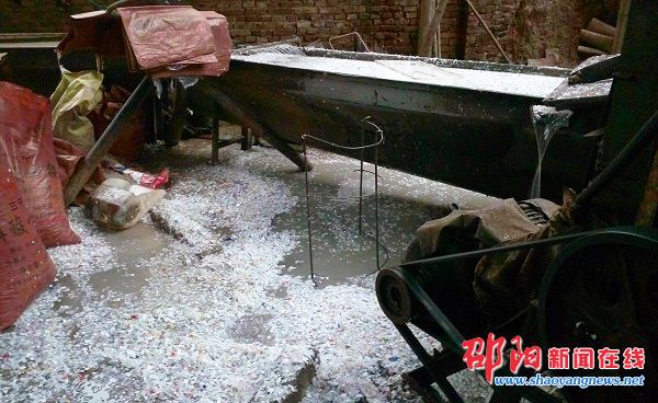 走进这个小作坊,记者顿时感到味道难闻,里面堆满了矿泉水瓶、饮料罐。一条生产线正在运行,让废塑料饮料瓶变成塑料碎片。在生产线的末端,塑料碎片通过运输带送入一个装满水的容器中,一名工作人员则用塞子将塑料碎片捞出来,随后用袋子装好。而清洗塑料的水也直接从容器内排出,流到外面去。