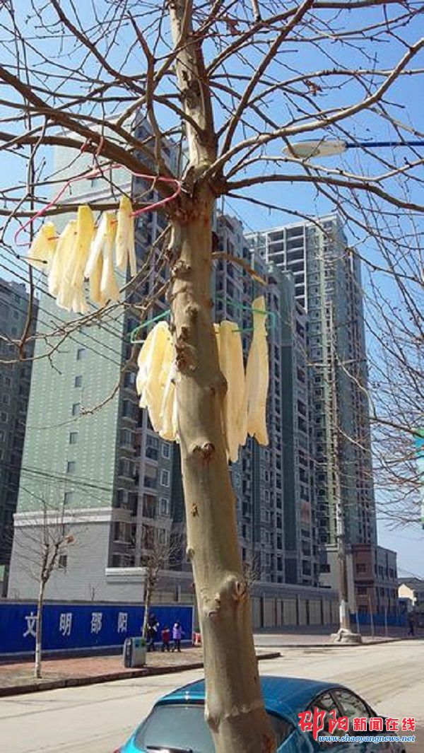 说着,唐红亮用手机展示他收集的一些乱堆乱挂图片。只见在某居民小区道路旁边的行道树上,高高晾晒着一批白色萝卜片;在某市场,则用雨布遮盖着一堆疑似建筑材料的物品,根据其上的灰尘和其下的苔藓来看,这批物品已经堆放多个年头了。