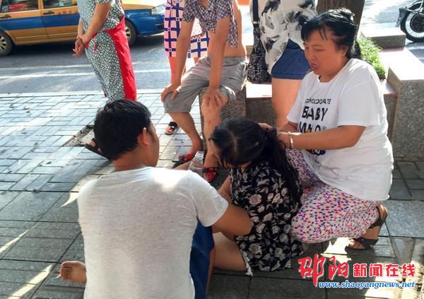 邵阳新闻在线讯(邵阳日报记者 谢冰)7月19日早上8时左右,在邵阳市工业街公园一号附近一早餐店门口,有一男一女瘫软在地,女的都已说不出话来了,这时旁边有两名中年妇女蹲在地上用手不停地在这位女子后背上下刮擦。