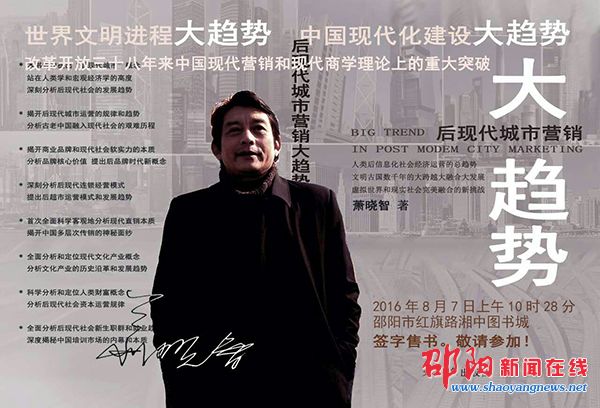 邵阳新闻在线讯(记者 蒋锡班)《后现代城市营销大趋势》首发式将于2016年8月7日上午10时28分在邵阳市红旗路湘中图书城举行,作者萧晓智先生将亲临现场签字售书。