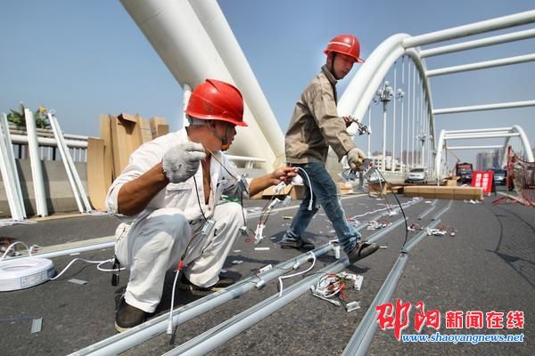 9月27日上午,在西湖桥上,市城市路灯管理所施工人员继续在西湖桥上装配竖型景观路灯。预计9月28日,西湖桥将以更加璀璨的姿态展现在邵阳人民面前。