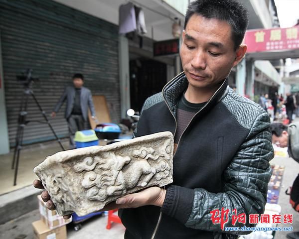 特意从安徽黄山赶来的占远兵展示清代工艺品——汉白玉花盆。