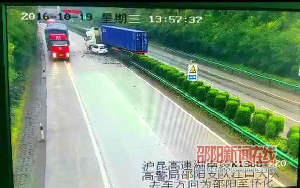 邵阳新闻在线讯(记者 宋三刚 通讯员 成世德 熊双)10月19日,沪昆高速西往东1368KM附近,一辆渝B牌照的重型半挂牵引车在行驶途中,车头突然甩向超车道,并将一辆小车带至中央护栏后冲至对向超车道。