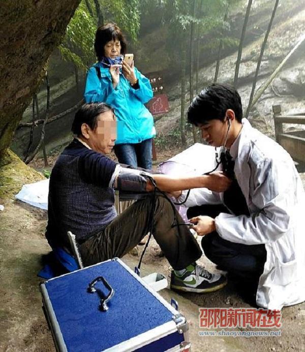 当天上午,天空淅淅沥沥下着小雨,南京“跟着大脚走”团队的游客正在崀山天一巷景区游览。10时30分左右,走在遇仙巷附近的游客叶先生突然出现心绞痛,伴随呼吸困难、大汗淋漓、脸色苍白等症状。随团的邵阳中旅导游林丽君发现后,立即脱下自己的外套披在叶先生身上,扶他到路旁坐下休息,并马上拨打了景区救援电话。
