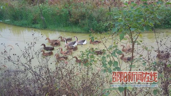 草坪下面,是一口小水塘,圈养的两只鹅和10多只鸭友人一般,肩并肩在水中怡然游弋。