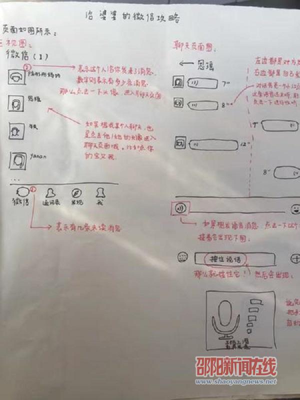 小郭今年23岁,在长沙某大学读研究生,在外地不能手把手地教外婆使用微信,这可怎么办?单纯写个说明书,这对老人来说,并不是那么容易看懂,那么画图吧!于是,小郭灵机一动,想到了通过画图,图文并茂地给外婆介绍,如何使用微信。小郭通过画出微信的界面、对话框,以及每个对话框代表的意思,来向外婆解释,微信是个什么东西,如何使用。