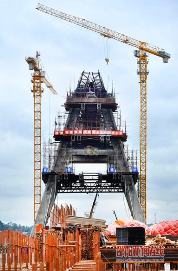 邵阳新闻在线讯(记者 申兴刚 )邵阳雪峰大桥采用的纵向双飞叶造型属国内首创。目前,71米高的主塔完成施工63米,北岸引桥阴历年前完成下部结构施工,南岸引桥阴历年前可全部完成施工,主梁0号与1号块即将开始挂篮施工,主梁5号块计划12月30日完工。预计全桥2017年6月底竣工通车。