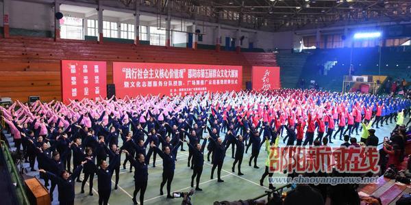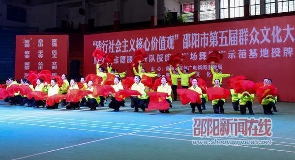 邵阳新闻在线讯(记者 陈贻贵 图/ 杨敏华)群众编,群众演,群众看,群众齐点赞。12月1日上午,大祥坪体育馆内歌声飞扬、舞姿蹁跹,“践行社会主义核心价值观”邵阳市第五届群众文化大展演暨文化志愿服务分队授旗、广场舞推广示范基地授牌仪式在这里隆重举行, 13支业余文艺团体500多人依次登台表演,以热情的舞姿展示出邵阳人民的靓丽风采。