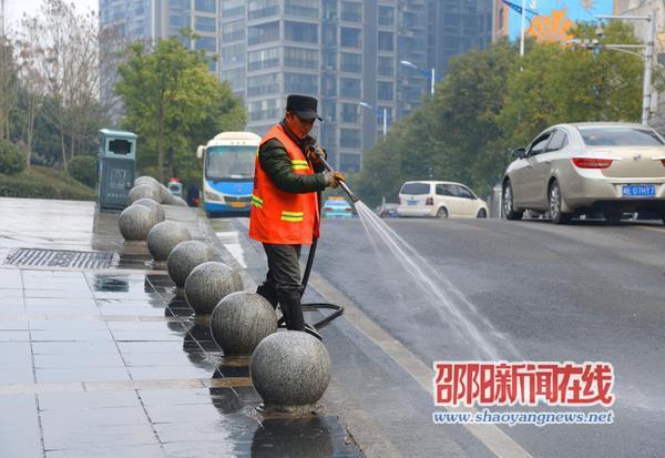 元旦节的早上,邵阳各主要街道上的车辆还很少,黄师傅一大早就把清洗车开到了双清区双清路上了,把车辆加满水,准备冲洗人行道。他们这一组有三个人,黄师傅负责开车,另一位也姓黄,他是负责搬运水管,还有一位陈师傅就负责冲洗路面。开车的黄师傅说,前一天晚上11时左右他们还在宝庆东路清洗路面,尽管当天是元旦节,但是他们没有休息,依然要坚守岗位,维护城市道路的清洁。