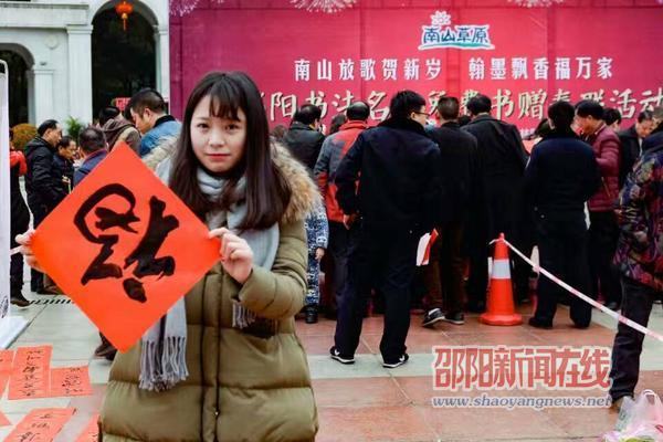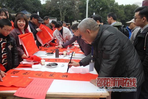 当天,是传统佳节小年,暖暖的阳光洒在市民的身上,格外温暖,城南公园年味渐浓。为给市民送上新春的祝福,当天,由市书法家协会联合湖南南山牧业有限公司、大德堂·翰林国艺馆共同举办的“邵阳书法名家免费书赠春联活动”在此拉开帷幕。“岁通盛世家家富,人遇年华个个欢”、“润泽万物气象新,天地祥和风光好”……活动现场翰墨飘香、书法家们激情四溢,隶、楷、行、草诸体兼备,让人应接不暇,大饱眼福。每一副对联写好后,就被市民小心地捧在手中,然后拿到一边晾干,再舒心地带回家。72岁的李桂香老人拿到对联后高兴地说:“手写的对联比印刷的对联强多了,贴在门上很喜庆,谢谢这些书法家们。”不少市民说,“书法名家现场书写对联,既接地气,又弘扬了国粹,熏陶了市民,服务了群众,希望这样的活动能持续搞下去。”