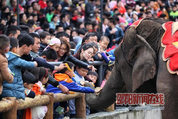 2016年4月4日,动物园游客与憨厚大象亲密接触。(罗哲明)