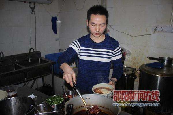 邵阳新闻在线讯(记者 陈贻贵)1月19日下午,邵阳市区人大路的重庆小面馆内,接到外卖订购电话后,店主申少彬和店员在厨房忙开了。申少彬用汤瓢把面汤舀到一次性碗里,之后把煮好的面放进去,打好包后,交到美团外卖送餐员的手上。