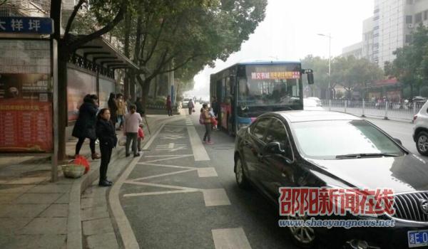 2月18日,记者从报社出发,沿着宝庆路向东,直至市公安局交警支队,发现5个站台及其前后30米范围内停有社会车辆。下午6时许,一辆小车停放在宝庆中路南侧大祥坪公交车站台前部,导致准备进站的公交车无法进入港湾,只好停在行车道上。