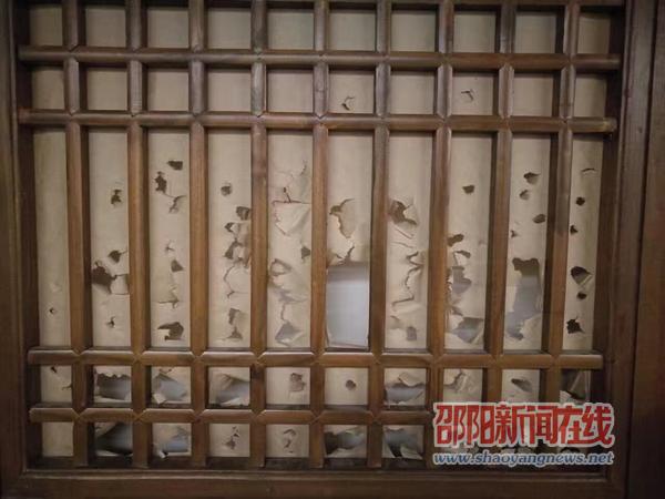 在博物馆一楼陈列馆宝庆古街区域内,一座蜡像人物手上的碗,被游客拧了下来;在另一处场景里,纸窗被游客戳满了窟窿;还原雪峰山战役的沙盘区域里,模型山头,被扯掉一块,露出的白色痕迹,非常显眼。