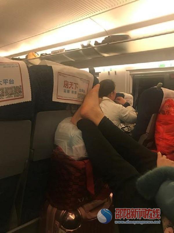 邵阳新闻在线讯(记者 马剑敏)光脚丫架在自己的行李上,丝毫不顾忌周边乘客的感受。3月1日晚,在由长沙开往邵阳的G6457列车上,一女性乘客的这一行为让人大跌眼镜。