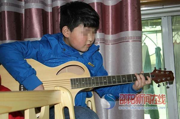 张洁说,小外甥很喜欢弹吉他,如今能够弹奏一些简单的曲目。说着,尧杰即兴表演了一曲《星星点灯》。手指拨弄琴弦间,动人的旋律在稚嫩的手指间跳跃。