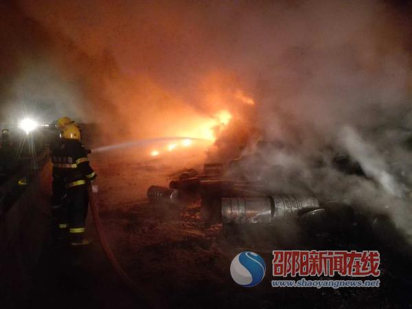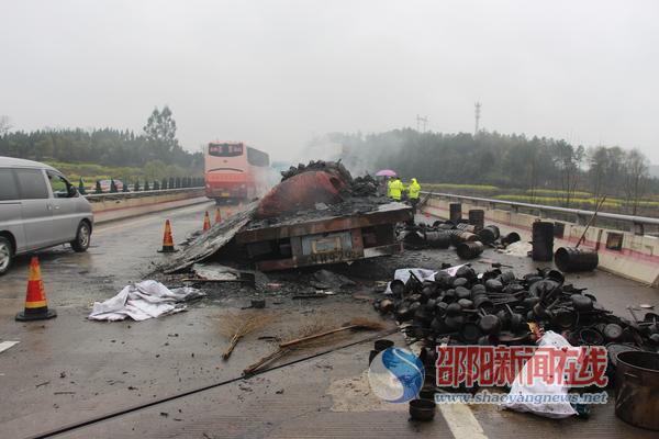 邵阳新闻在线讯(记者 宋三刚 通讯员 陶源)3月22日凌晨,沪昆高速上,一辆运载五金、杂货的挂车在行驶中突然起火,火势迅速蔓延,满载的货物几乎全被烧毁。事发后,路政、消防等部门人员到场救援,终将大火扑灭。