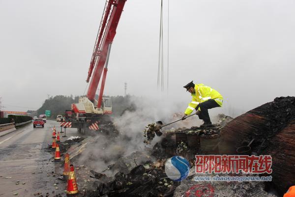 当日3时20分许,湖南省高管局邵阳管理处路政人员郭岫峰及其队友,从隆回收费站附近查看一起小交通事故后返回市区。当他们行至K1257+775m处时,郭岫峰发现对向的车道上出现火光。郭岫峰立即向上级汇报,停好车,赶往现场对来向车辆进行疏导,避免次生事故。没过多久,高速交警、路政、消防、养护等部门施救力量赶到现场,并迅速投入救援工作。随即,交警部门对道路实施了临时交通管制。