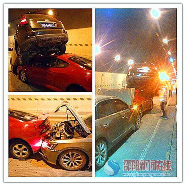 4月4日为清明节假期的最后一天,高速公路上迎来返程车流高峰。当日13时许,川籍驾驶员贺强(化名)驾车,沿沪昆高速从西往东方向行至洞口县境内的大湾隧道时,突然看见前方有两车追尾停在隧道内,马上紧急刹车。不料,贺强的这一紧急刹车,导致后面的两台车接连发生追尾,且把他的车子铲起——只有前轮着地,后轮已经骑跨在了后面的车上。所幸的是,驾驶员都采取了有效措施,整个交通事故没有造成人员伤亡。