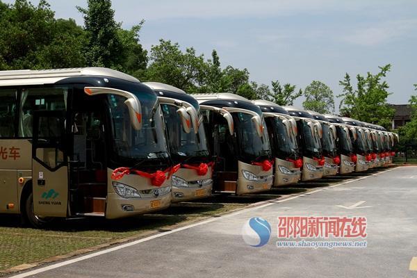 4月28日下午,崀山景区旅游观光车首发仪式在崀山北大门总站举行。当天,首批投入运营的有32座的大巴车15台、场内换乘车6台。今后,从崀山北大门总站到各景点站点,旅游观光车将实行不间断循环运行的公交化模式,游客可在想去的景点自由上下车游览参观。所有购买崀山景区门票的游客,均可免费乘坐观光车游览景区。通讯员 颜克明 摄。