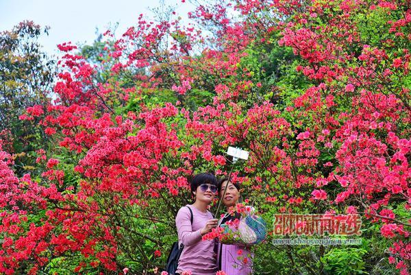 邵阳新闻在线讯(通讯员 贺上升)4月30日,游客在隆回县金石桥镇望云山省级森林公园杜鹃花海开心自拍。4月下旬以来,该园内漫山遍野的千亩杜鹃花争奇斗艳,吸引游客畅游杜鹃花海,如痴如醉,争相用手机记录美丽的花海美景,成为该县五一小长假旅游火爆景点。
