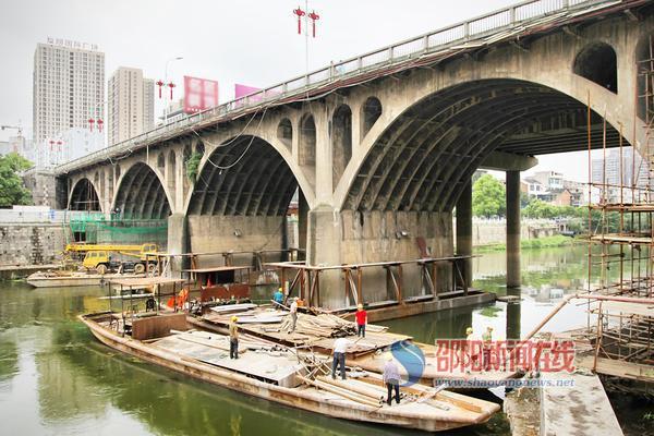 邵阳新闻在线讯(记者 罗哲明)5月22日,施工人员在对邵阳市区邵水桥进行加固维修作业。邵水桥始建于1965年,为市区东西向的一条通道,两车道。1994年,为适应宝庆路扩改,老邵水桥的南边新建一全宽为13.72米、预应力为5跨简支砼T型梁桥,标准跨径23米,全长125米,桥面长115米。