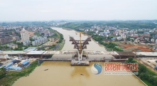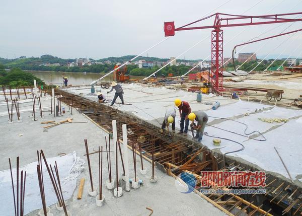 邵阳新闻在线讯(记者 谢冰)5月24日,邵阳市雪峰大桥建设工地上,工人们正在紧张施工,为6月6日的桥面贯通做好铺垫。