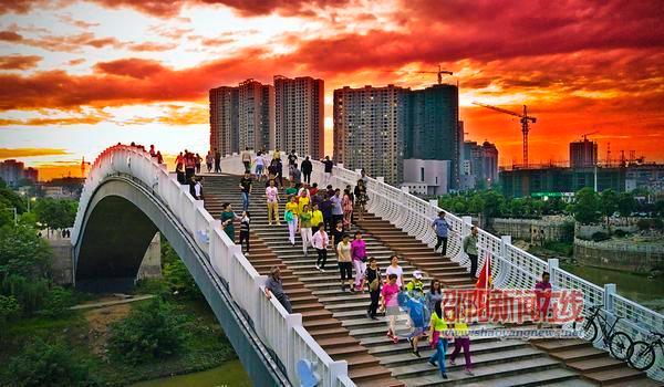 邵阳新闻在线讯(记者 罗哲明)5月25日19时30分许,成群结队的户外运动爱好者正穿越邵阳市区步月桥,在夏日火烧云的映衬下,形成一道靓丽的风景。日前,一些市区户外运动爱好者倡导“远离牌局、放下手机”,开展千人健身夜间健步走活动。