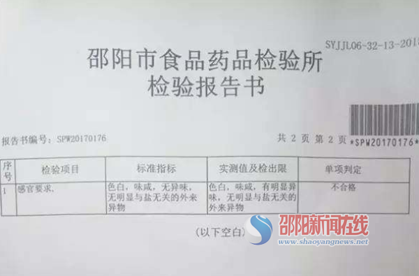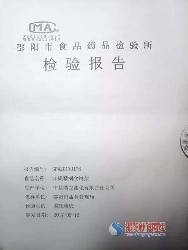 市盐务管理局市场部副部长李华斌向记者展示了市食品药品检验所的检验报告。检验结果显示,中盐皓龙的食用盐色白,味咸,有明显异味,判定为感官要求不合格。
